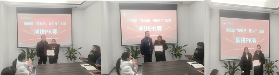 ? ? ? ?征程正未有窮期,不待揚鞭自奮蹄。?市場部秉著貫徹公司2022年“整隊伍 強執行”的活動精神,以提升市場部人員的專業水平,解決實際工作問題的能力為目標,于2023年1月17日在和諧樓一樓會議室舉行了年度演講PK賽,特邀公司副總經理兼財務部長陳春林、公司副總經理兼市場部部長羅來虎、人事主管陳琦擔當評委,比賽由汪勁松主持。