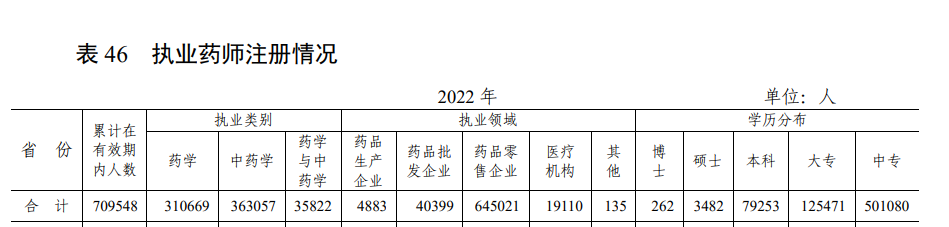 《年報》還對執業藥師的注冊情況進行了統計,截至2022年底,全國共有執業藥師709548人。其中藥品零售企業注冊的人數最多,約645021人。藥品生產企業的注冊人數為4883人,藥品批發企業的注冊人數約為40399人,醫療機構的注冊人數為19110人,其他135人。(轉自第一藥店財智)
